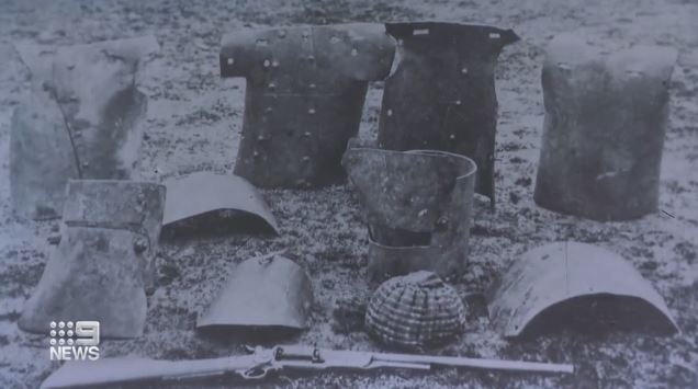 Two of the plates hold true iconic moments of Australiana. One is of the armour of the Kelly gang, laid out on a lawn as Dan and Ned Kelly faced the beak.